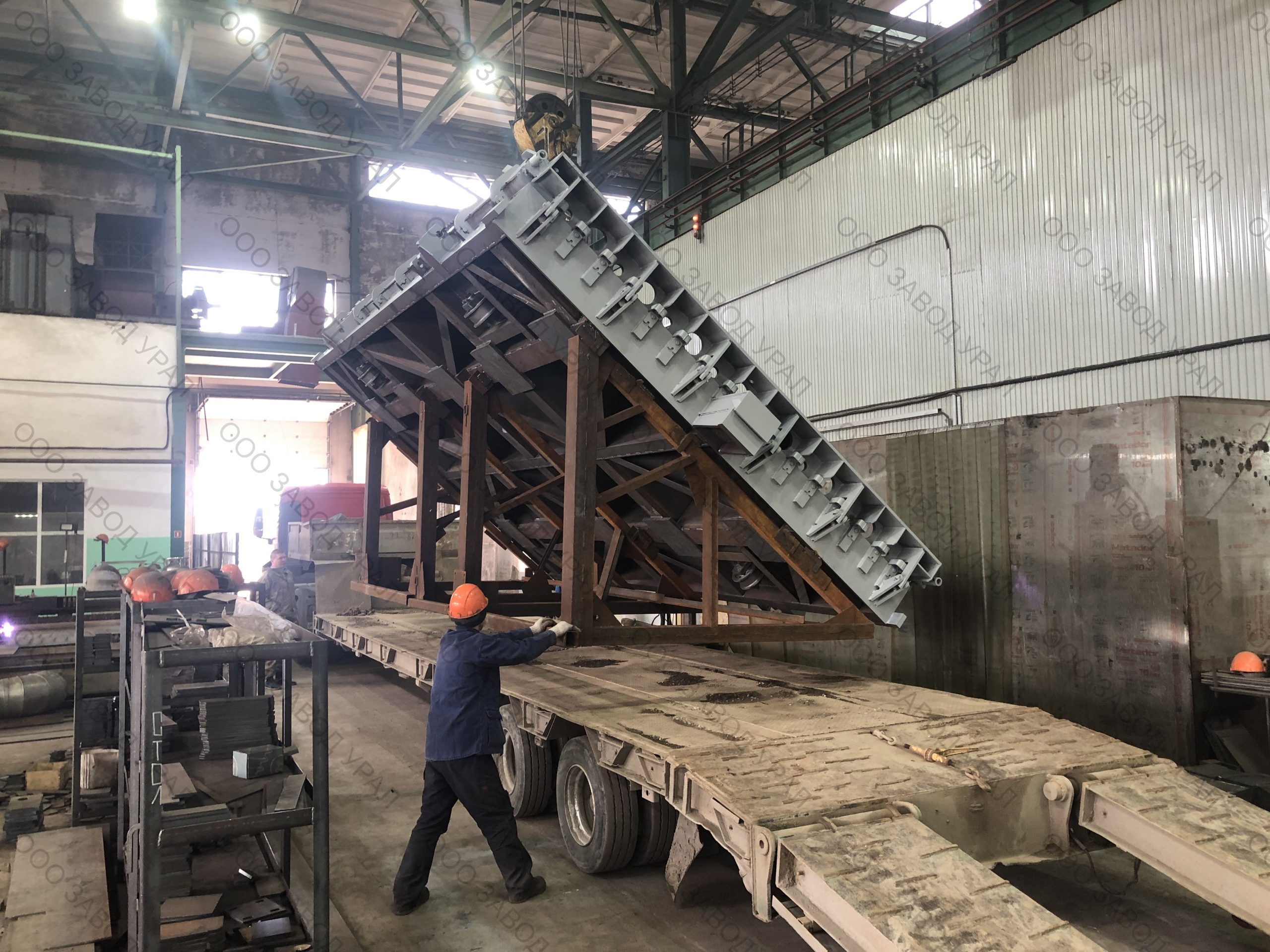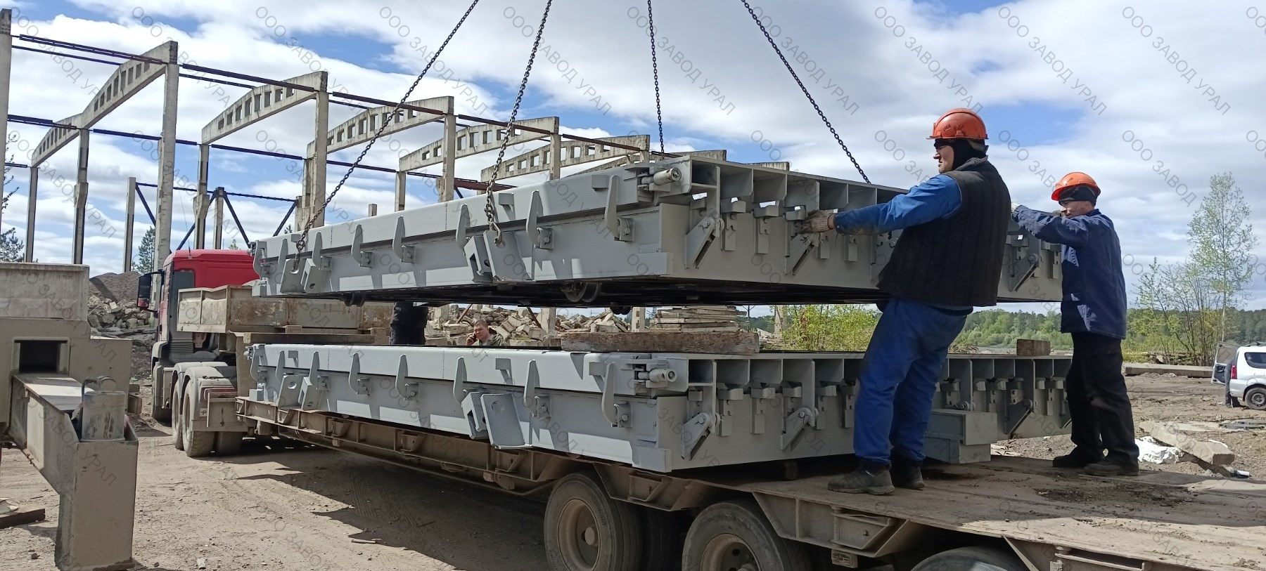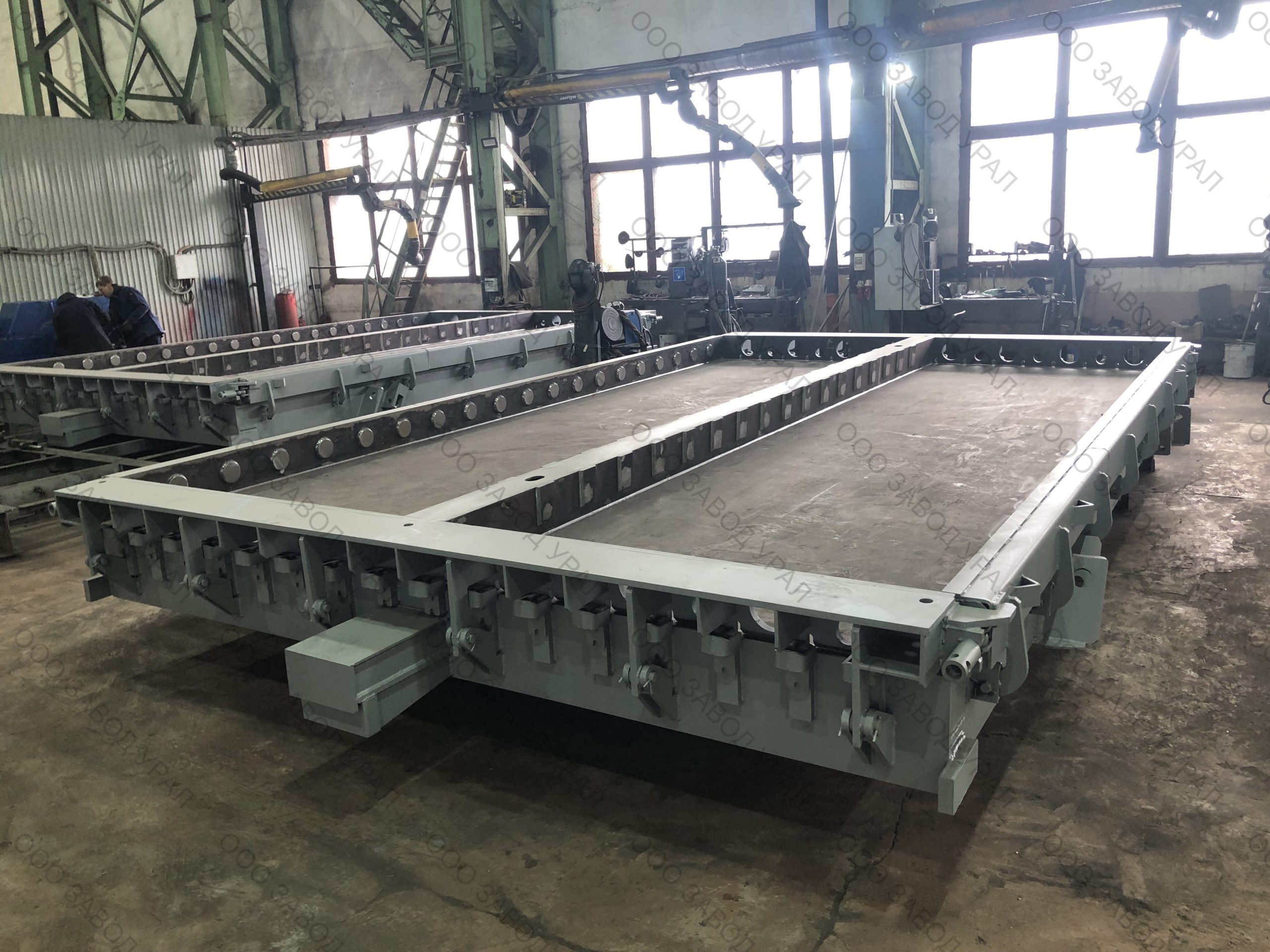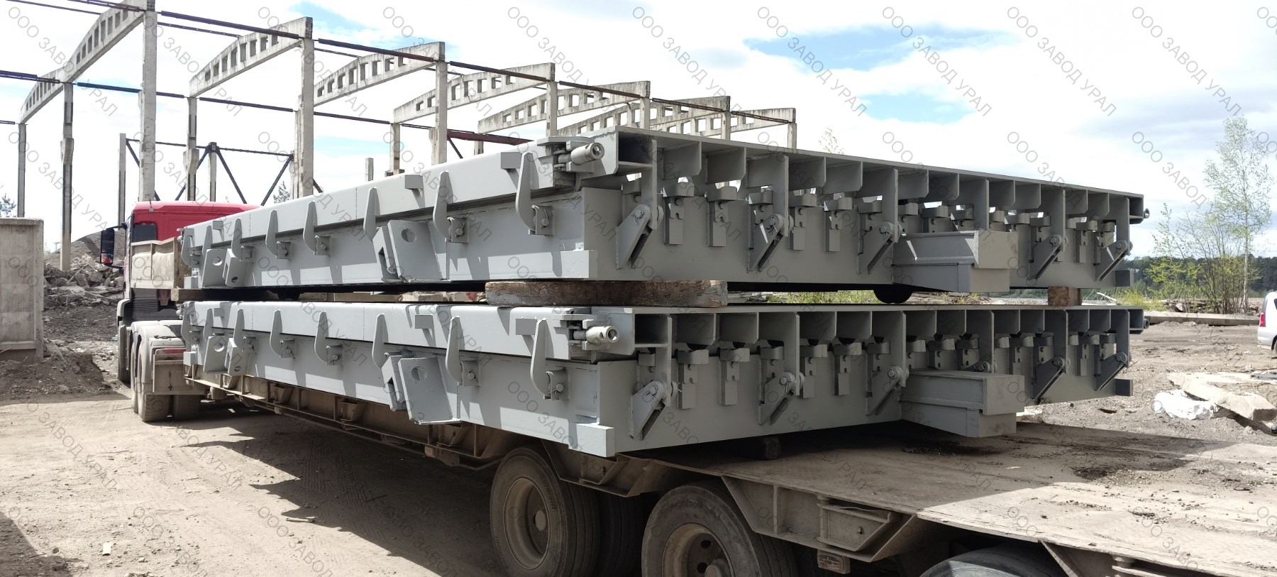 Металлоформы для производства плит перекрытия изготовлены по проекту заказчика. Ввиду того, что форма спроектирована сразу на два изделия, её ширина превысила допустимые габариты по выгрузке. Была спроектирована рама для вывоза формы под наклоном с последующим размещением на трале с помощью крана большой грузоподъемности.