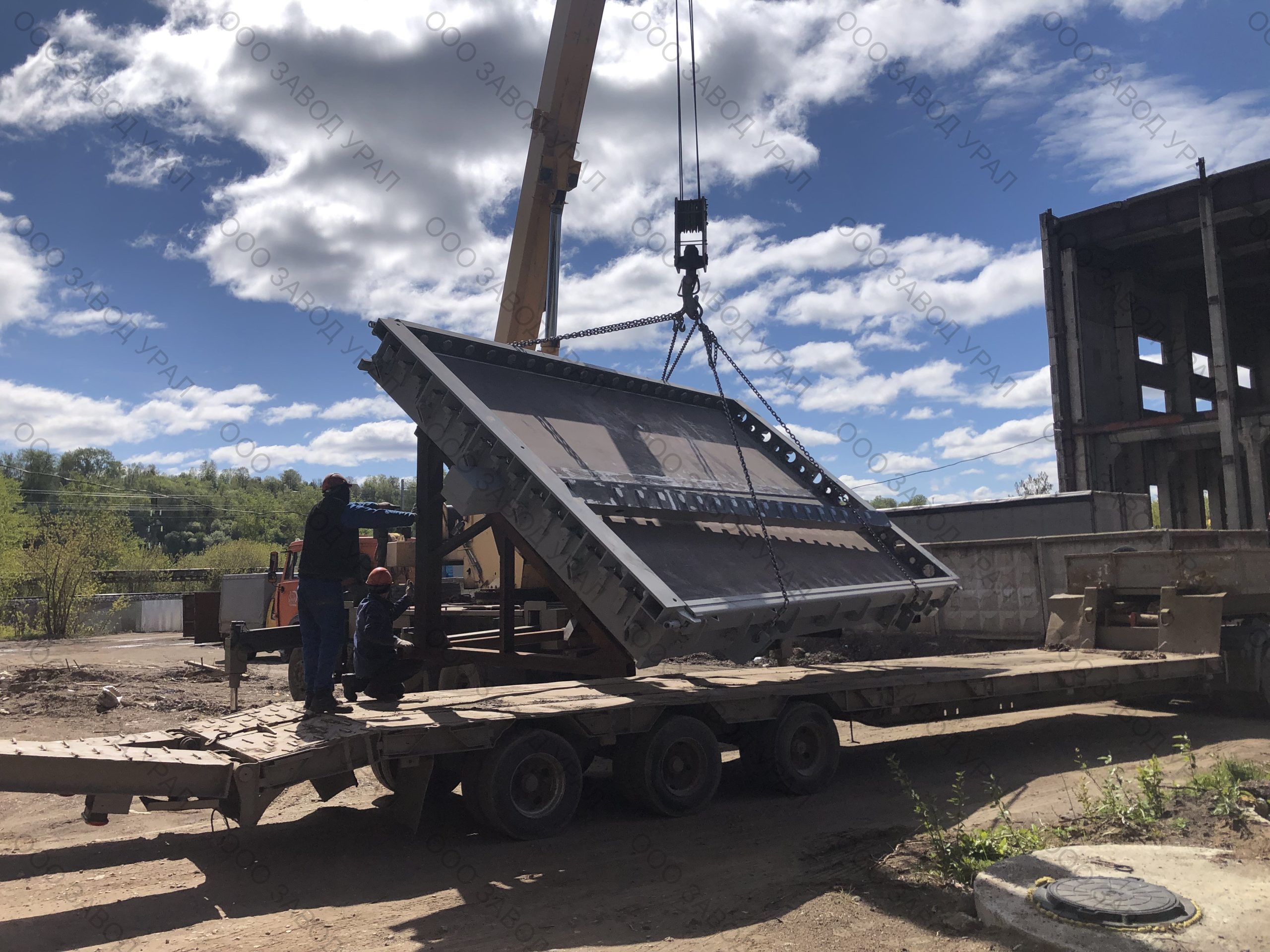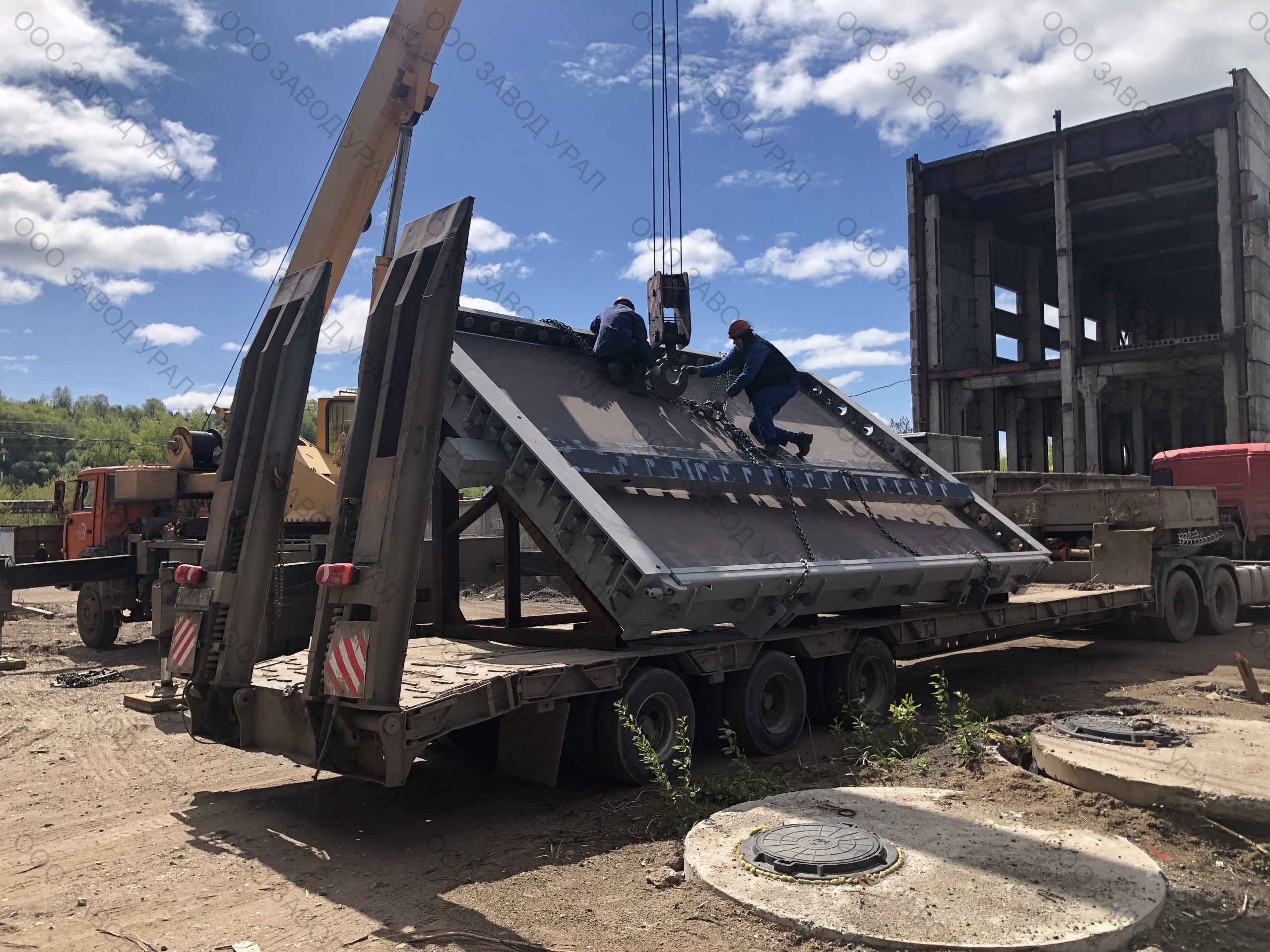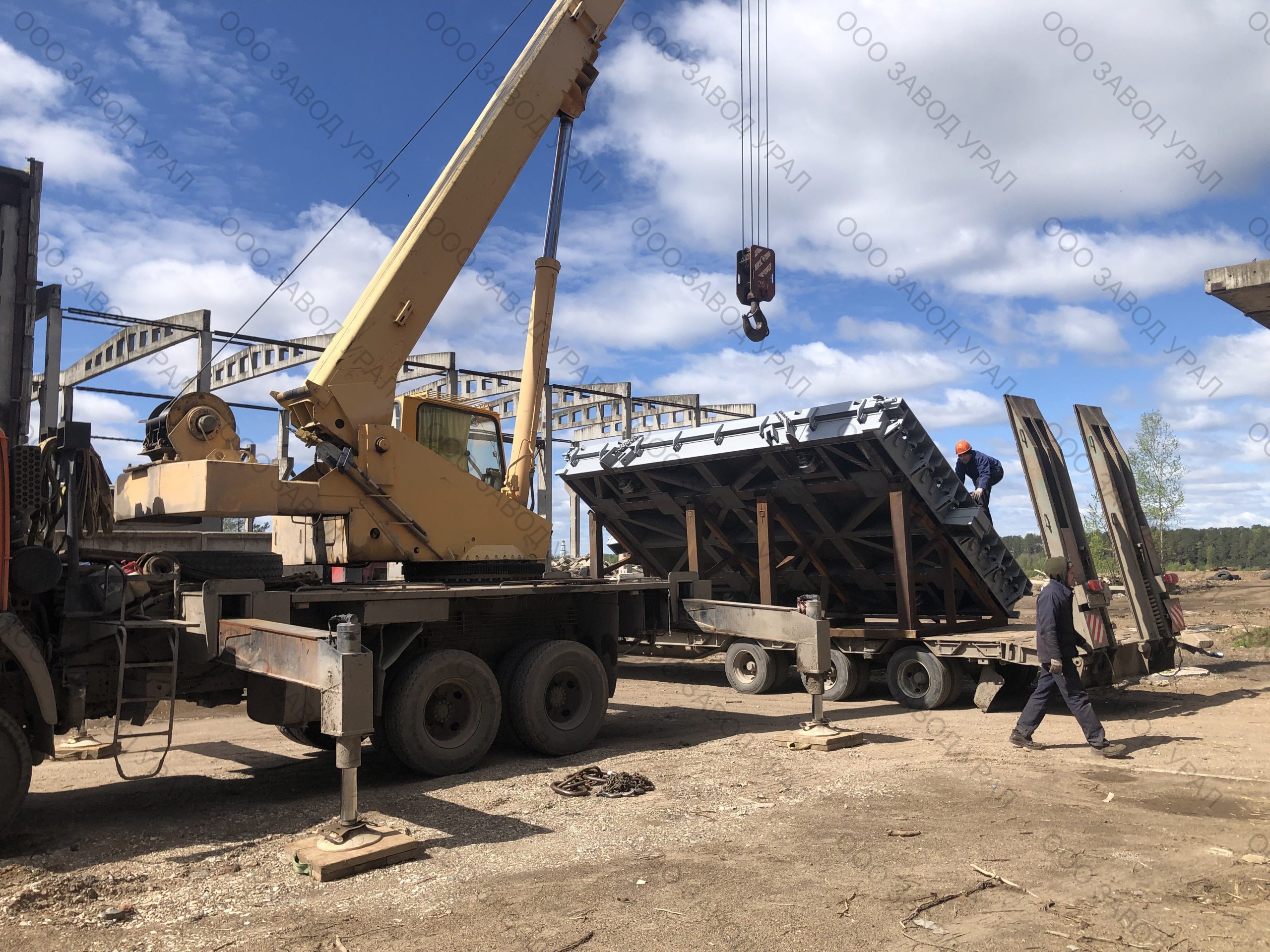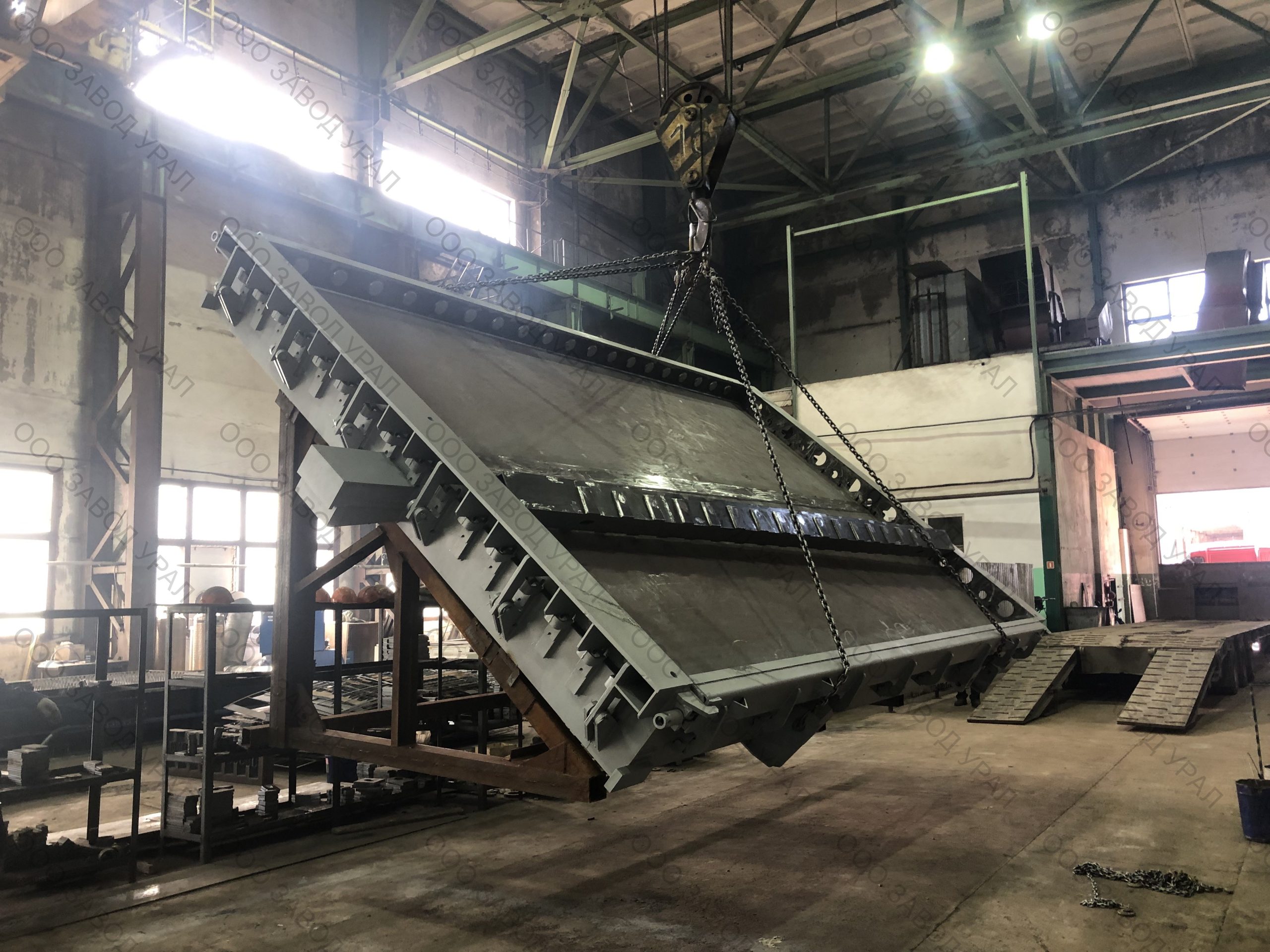 Металлоформы для производства плит перекрытия изготовлены по проекту заказчика. Ввиду того, что форма спроектирована сразу на два изделия, её ширина превысила допустимые габариты по выгрузке. Была спроектирована рама для вывоза формы под наклоном с последующим размещением на трале с помощью крана большой грузоподъемности.