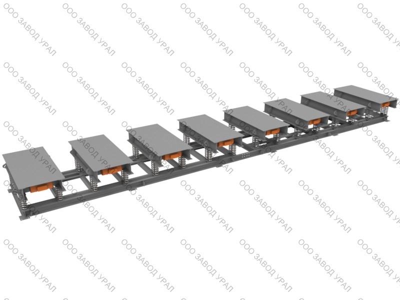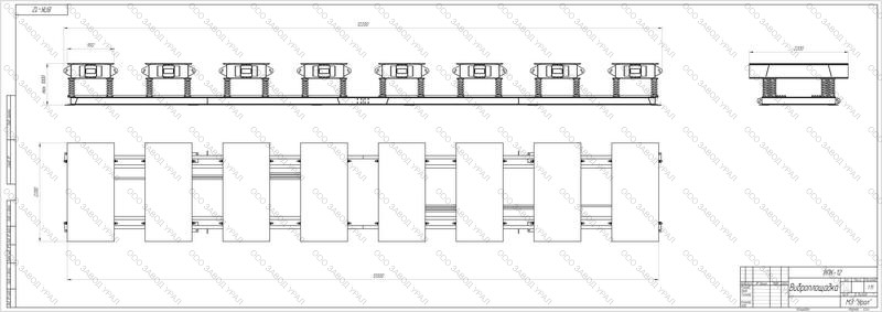 Виброплощадка «ВПК-12» состоит из 8 вибротумб, смонтированных на одном основании. (рама разделенная на 2 части, для удобства транспортировки) Вибротумба состоит из подвижной рабочей части, закрепленной на подпружиненных опорах. На подвижной рабочей части вибротумбы установлены 2 вибратора «ВИ-107Н», создающие вертикально направленные колебания, передаваемые форме и вибрируемой массе, горизонтально на подвижной рабочей части.
