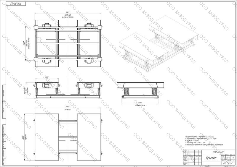 Виброплощадка «ВПК-3» состоит из 2 вибротумб, смонтированных на одном основании. (рама цельная) Вибротумба состоит из подвижной рабочей части, закрепленной на подпружиненных опорах. На подвижной рабочей части вибротумбы установлены 2 вибратора «ВИ-107Н», создающие вертикально направленные колебания, передаваемые форме и вибрируемой массе, горизонтально на подвижной рабочей части.